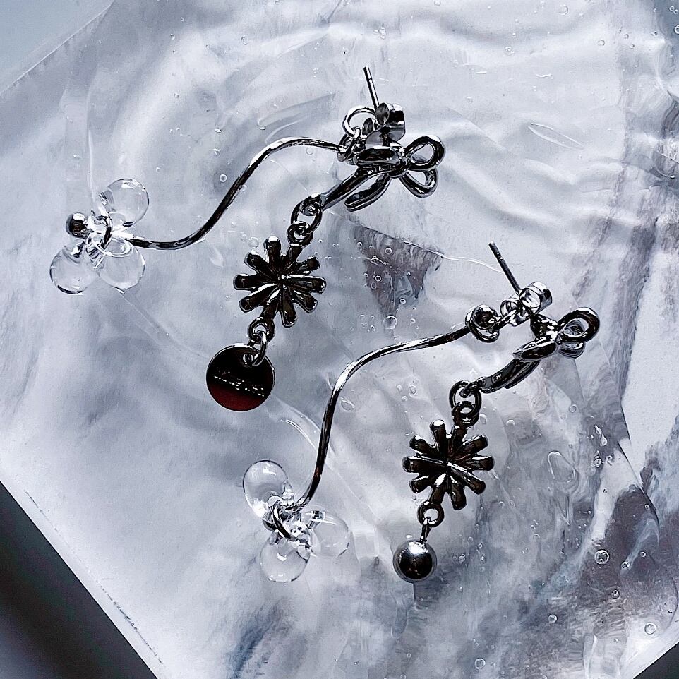 ※ご購入前にinformationをご一読下さい。 リボンとフラワーを合わせた、甘過ぎない小ぶりピアスです。 2way使用になっております。 こちらはピアスのみになります。 ・ピアスポスト サージカルステンレス ・重さ(片耳) 約2.8g ・長さ 約5cm