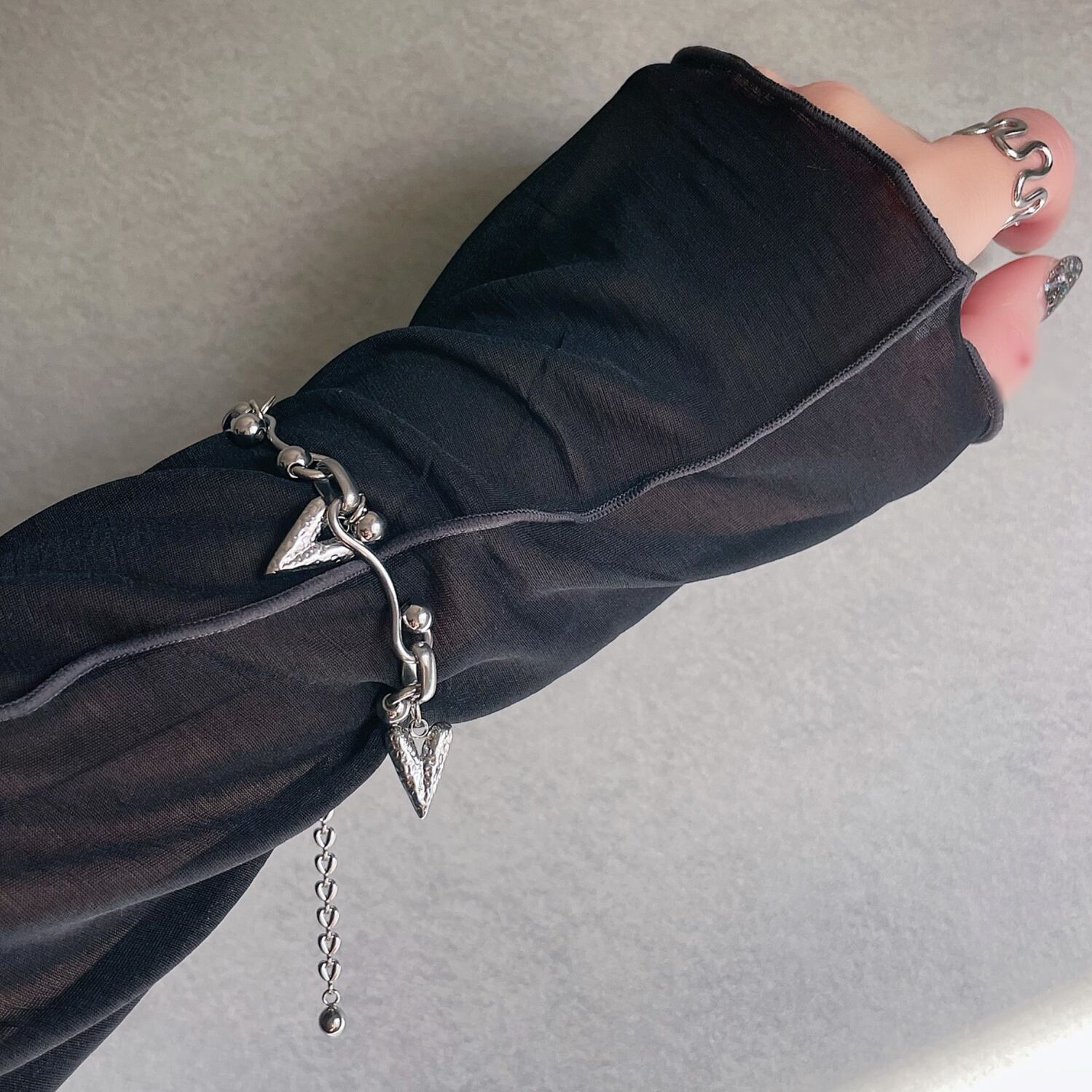 ※ ご購入前にinformationをご一読下さい。 デザインのあるチェーンに、ハートチャームを散りばめたスタイリッシュなブレスレットになります。 チェーン ステンレス チャーム ステンレス 長さ 約19cm 重さ 約27.5g