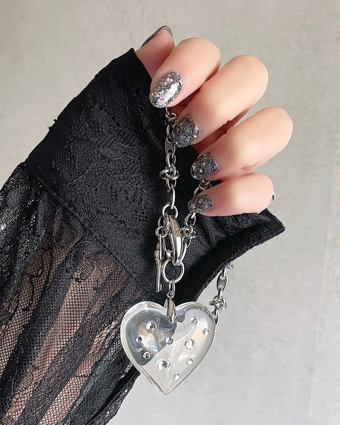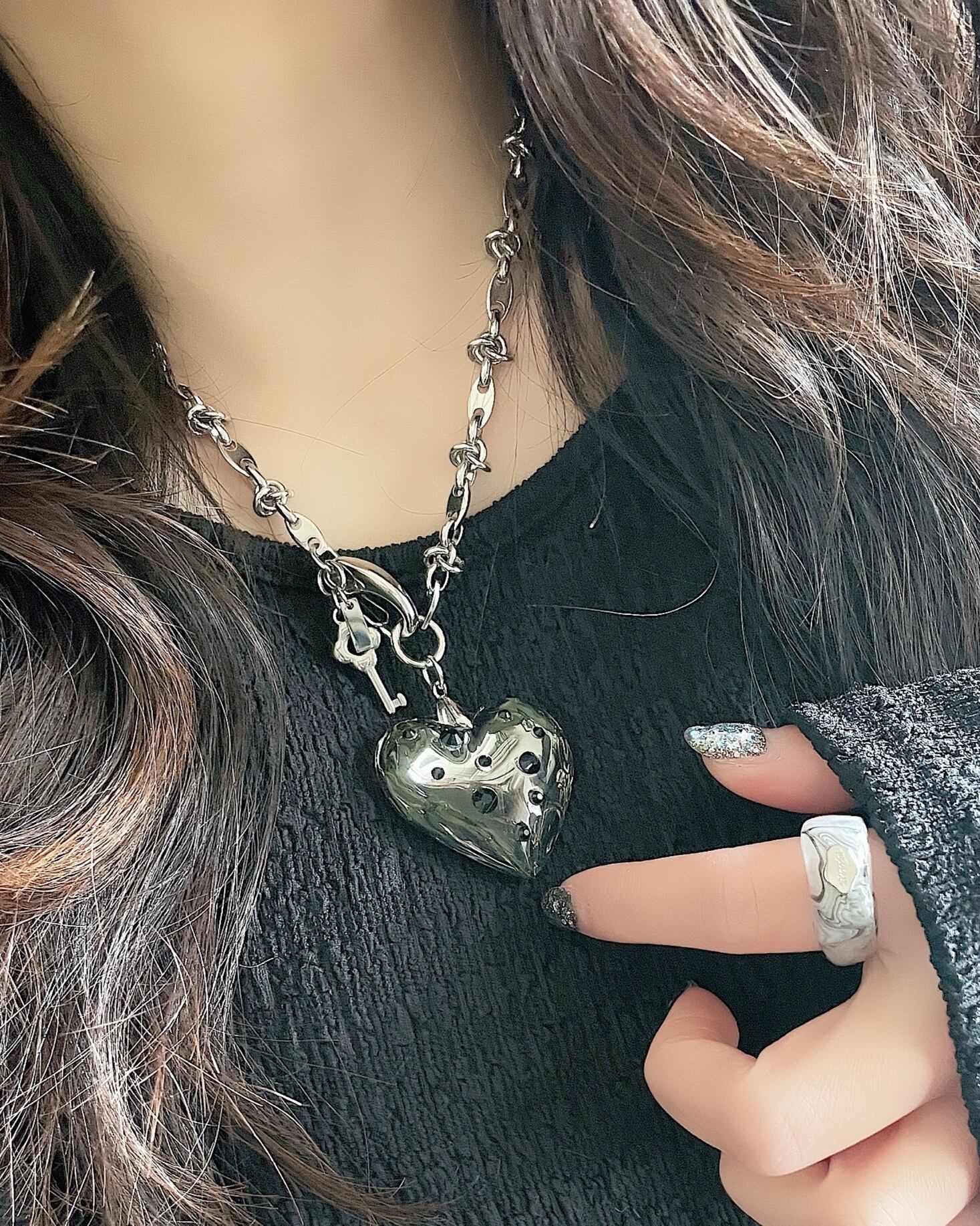 大きなガラスのハートチャームが主役のネックレスになります。