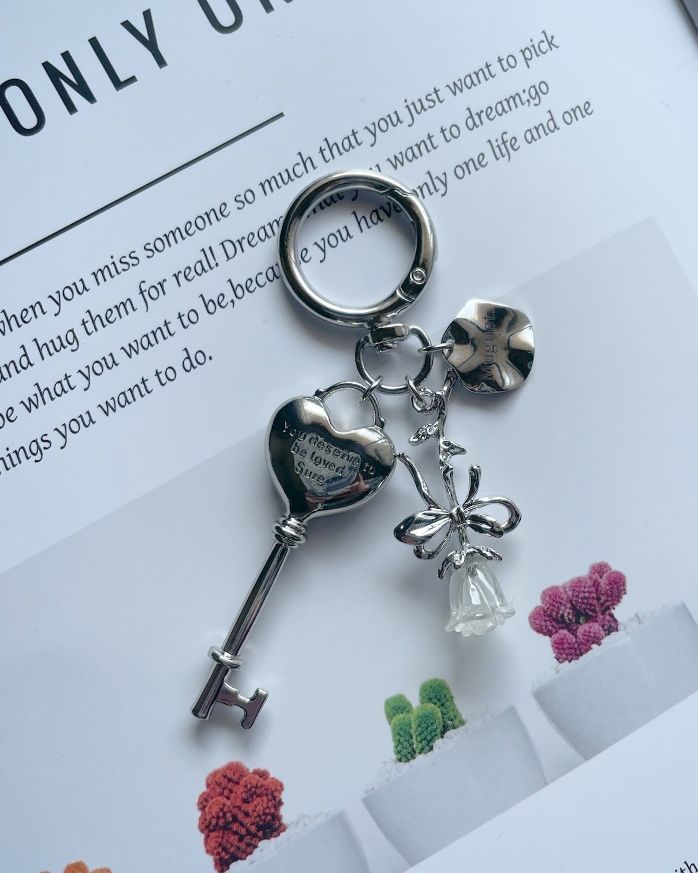 ※ご購入前にinformationをご一読下さい。 カギチャームとバラのシンプルキーホルダーになります。 キーリングやバックチャームなど、お好きなご使用方法で楽しんでいただけます。